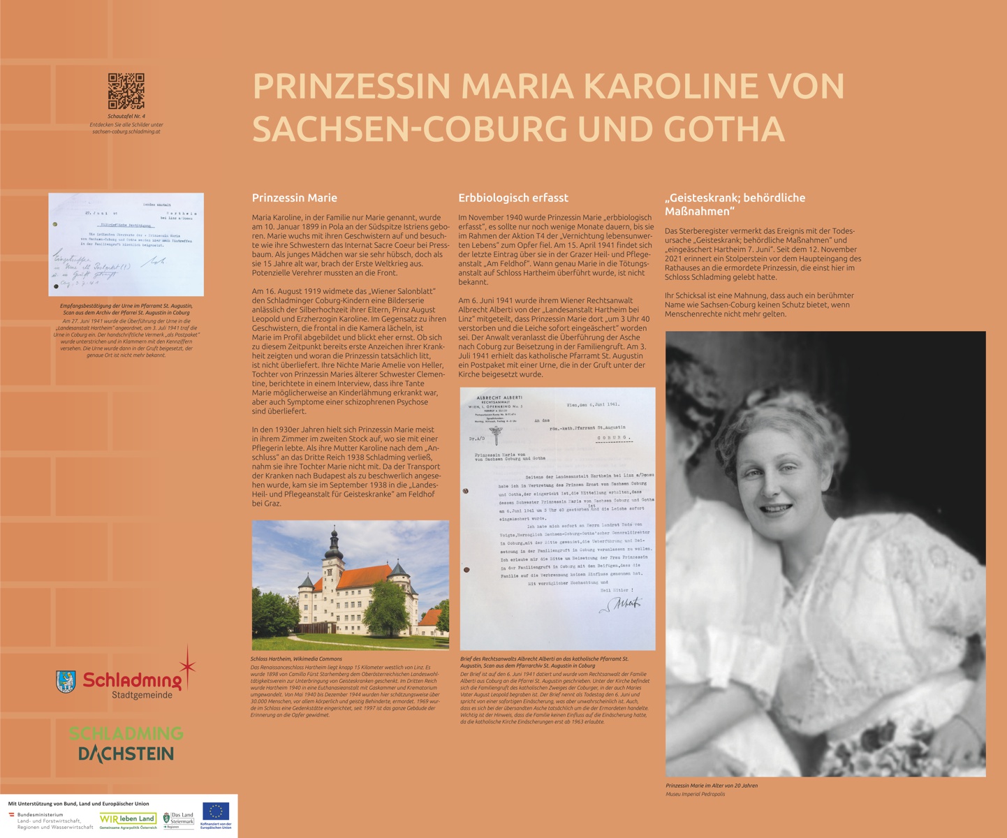 Im ehemaligen Schloss Sachsen-Coburg, dem heutigen Rathaus, erzählen 14 Schautafeln, Gemälde und ein Stammbaum die faszinierende Geschichte der brasilianischen Kaiserfamilie in Schladming.